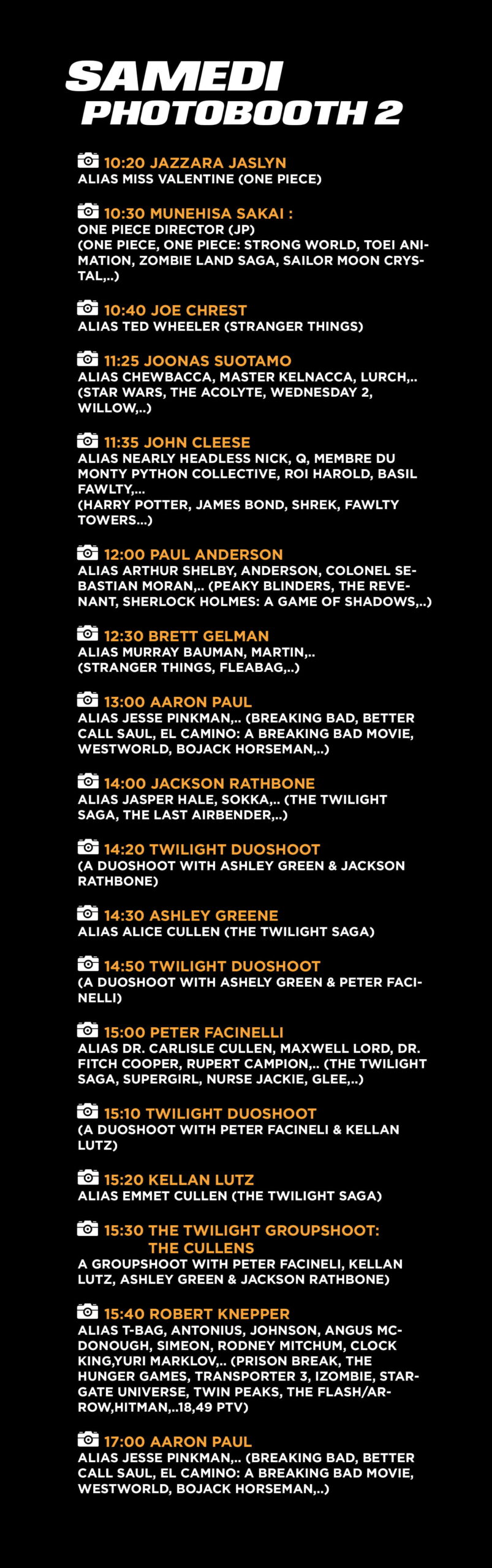 PhotoboothProgramme Votre photobooth photo Download photo Plus d'info Photobooth Partners FAQ Plan Hotel Règlement d’armes Accessibilité Billets hiddenLe programme du photobooth sera annoncé prochainement. ACHETEZVOTRE BILLETSMAINTENANT !BILLETS